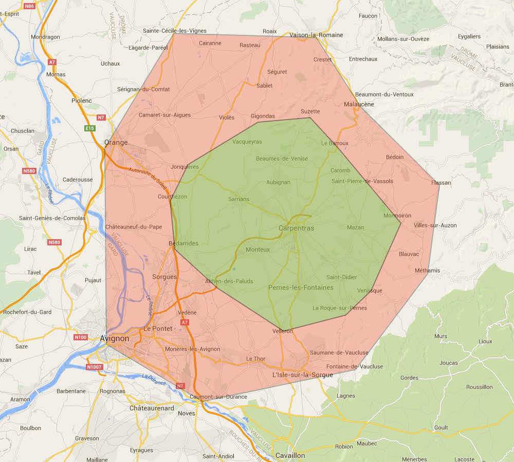 Avignon, Bédoin, Blauvac, Cairanne, Camaret-sur-Aigues, Caumont-sur-Durance, Châteauneuf-de-Gadagne, Châteauneuf-du-Pape, Crestet, Flassan, L'Isle-sur-la-Sorgue, Jonquerettes, Lagarde-Paréol, Malaucène, Méthamis, Morières-lès-Avignon, Orange, Le Pontet, Rasteau, Sablet, Sainte-Cécile-les-Vignes, Saint-Marcellin-lès-Vaison, Séguret, Sérignan-du-Comtat, Sorgues, Le Thor, Travaillan, Vaison-la-Romaine, Fontaine-de-Vaucluse, Vedène, Villes-sur-Auzon, Violès.